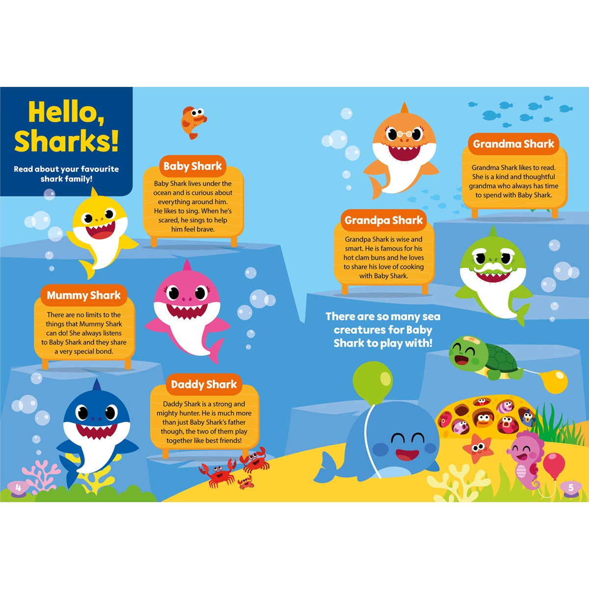Fun-filled sticker activity book with puzzles and colouring. 14 colourful sticker pages including 1 page of sparkly holographic stickers. Featuring the well-loved sharks, Mummy, Daddy, Grandma, Grandpa and of course BABY SHARK!
