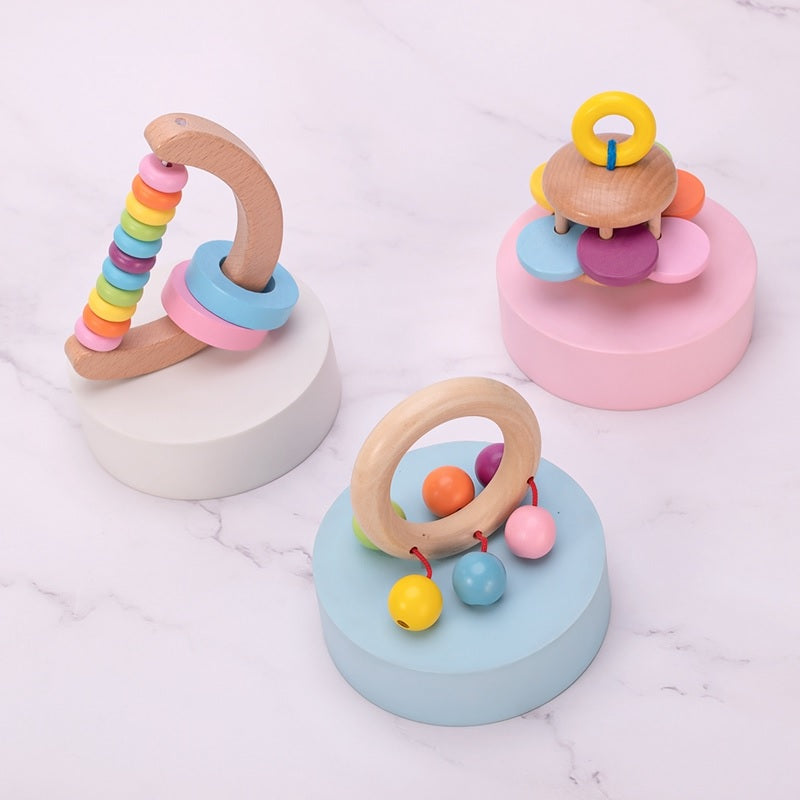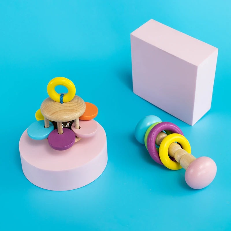 Our Montessori inspired rattle set is often a baby's first toy that will stimulate the baby's senses and develop their awareness as they learn to grasp, shake, twist and squeeze. Rattles are a must-have item for every nappy bag whether you are at home, travelling or out and about. All the rattles in this gift pack are lightweight wooden toys that are educational and exercise babies' hand-eye coordination. Hang the Rattles on the Crib or on the Pram while supervising at all times. All items are made with baby safe materials: