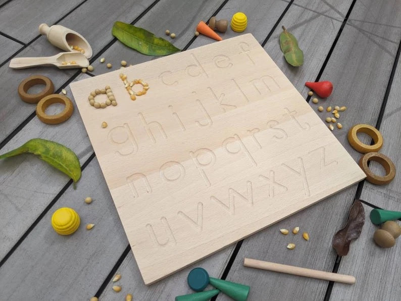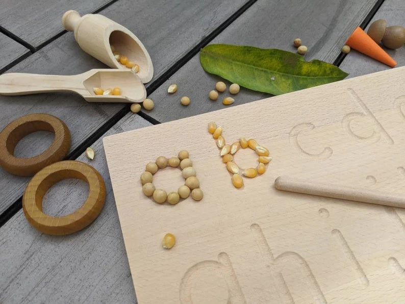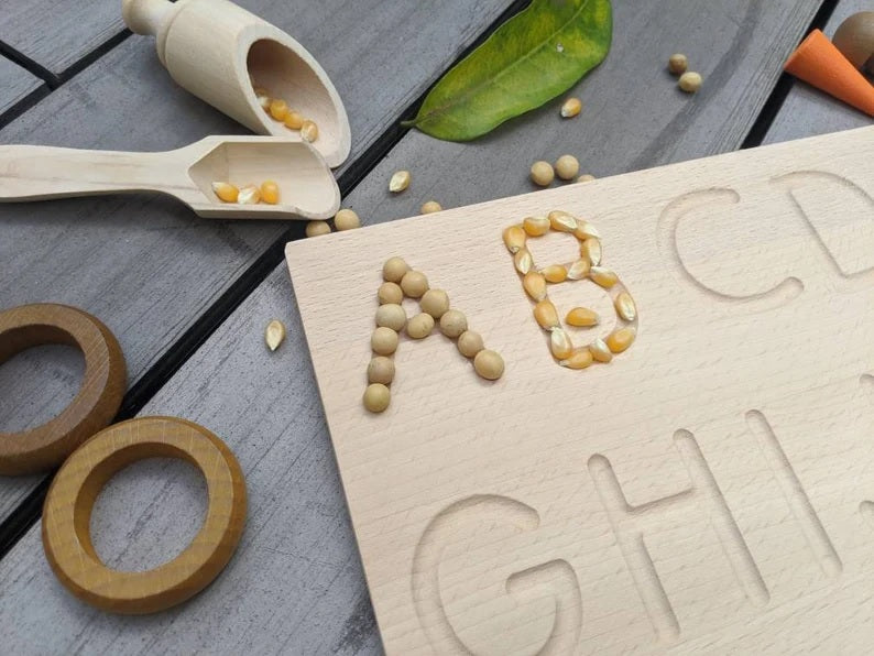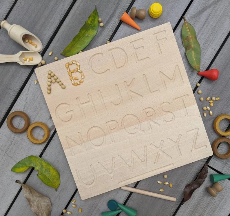 If your little one is ready to start developing their writing skills, this Alphabet Tracing Tablet is perfect. The letters of the tray are engraved into the board, meaning your little one can use the wooden pen to practice their pencil skills. This will help to refine the much-needed strength in their fingers, preparing them for starting school. For small children repetition is the key to learning the alphabet, let them decorate it with organic materials or other coloured materials for faster visual learning.