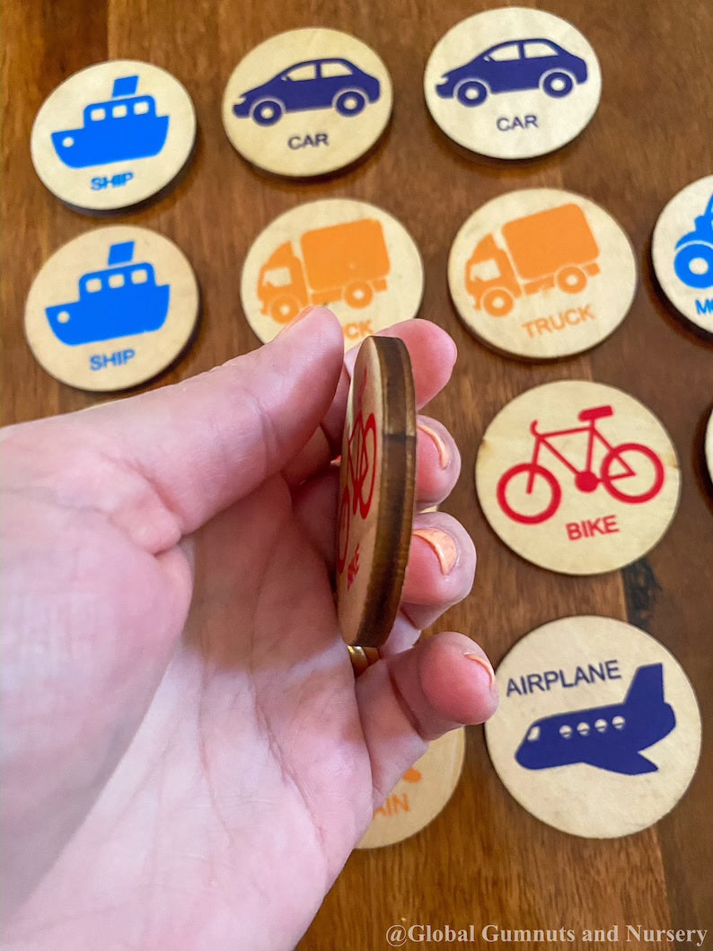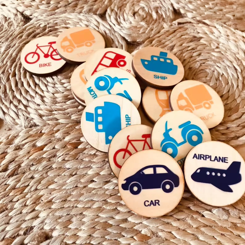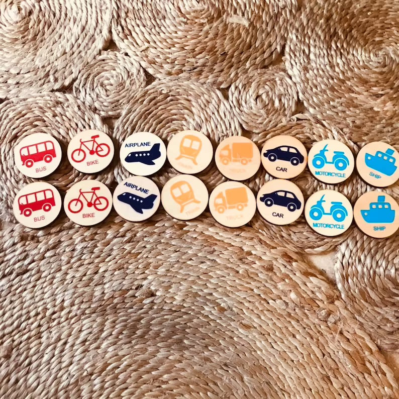 Build your child's memory and recall with these adorable Memory Matching Woden Transport Discs. Placing them all face down, you and your child will play together, taking turns to flip each card until your reveal a pair. Playing together will improve your child's social skills, learning different words and assist them with their motor skills development as they lift and flip each disc.