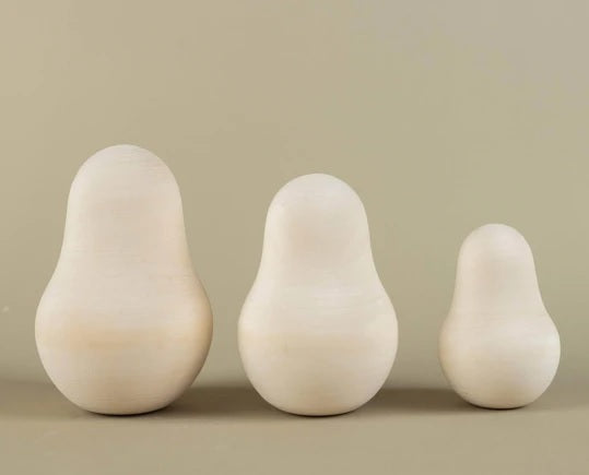 Young children love our DIY Wooden Nesting & Stacking dolls as it gives them a surprise when they find something inside. Soon they begin working to undo and put together the dolls in the correct order. Nesting materials like these dolls help children understand spatial relationships, develop fine-motor coordination, build the language of comparison (big to smaller) and prepositions (inside, outside, under). These dolls also give children the opportunity to concretely experience the concept of a whole object that contains individual parts that are nestled within. Comes with 3 dolls - can be painted for a whole family fun!