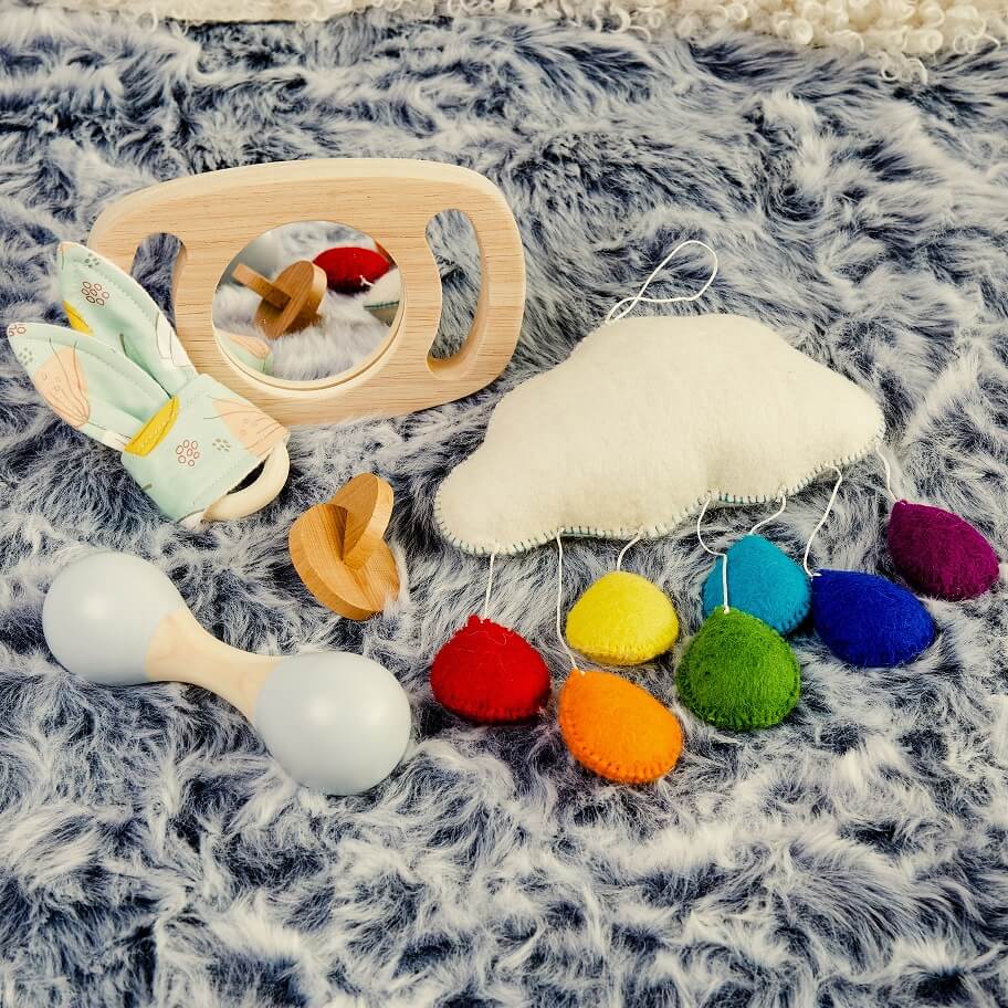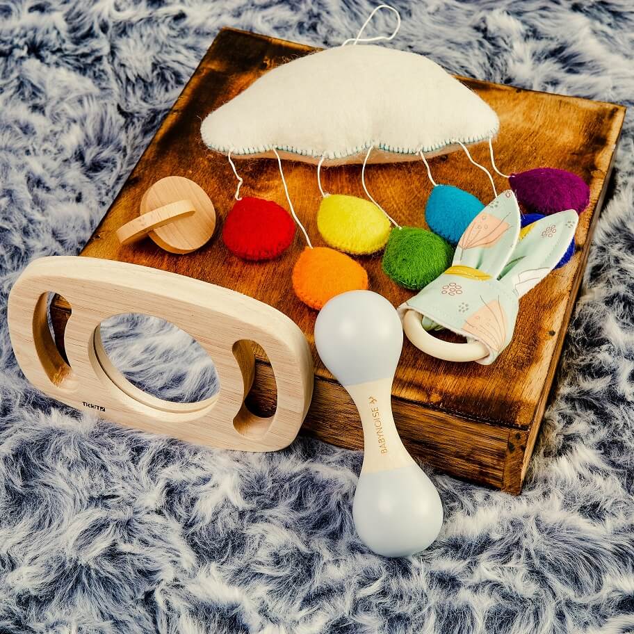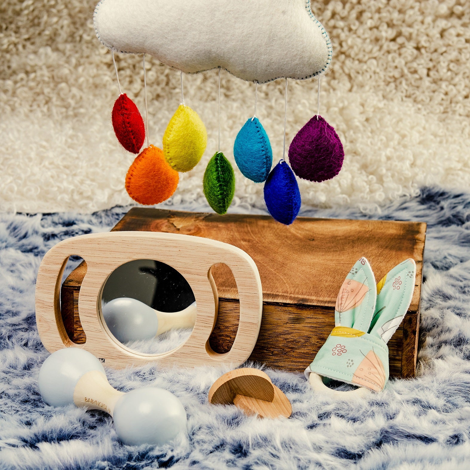 1. Organic New Zealand Wool Cloud and raindrop mobile (medium) - Babies will focus on and reach for the mobile, helping them with their fine motor and thinking skills. 2. Easy Hold Wood Mirror Suitable for babies - Perfect for tummy time, as the little one tries to lift this mirror, they will develop their strength and movement skills. 3. Babynoise Wood Double Maracas - Helps babies to develop their sensory skills and build their arm strength. 4. Montessori Infant Interlocking Disc (wood) - Will teach babies how to grip items and transfer them between their hands.