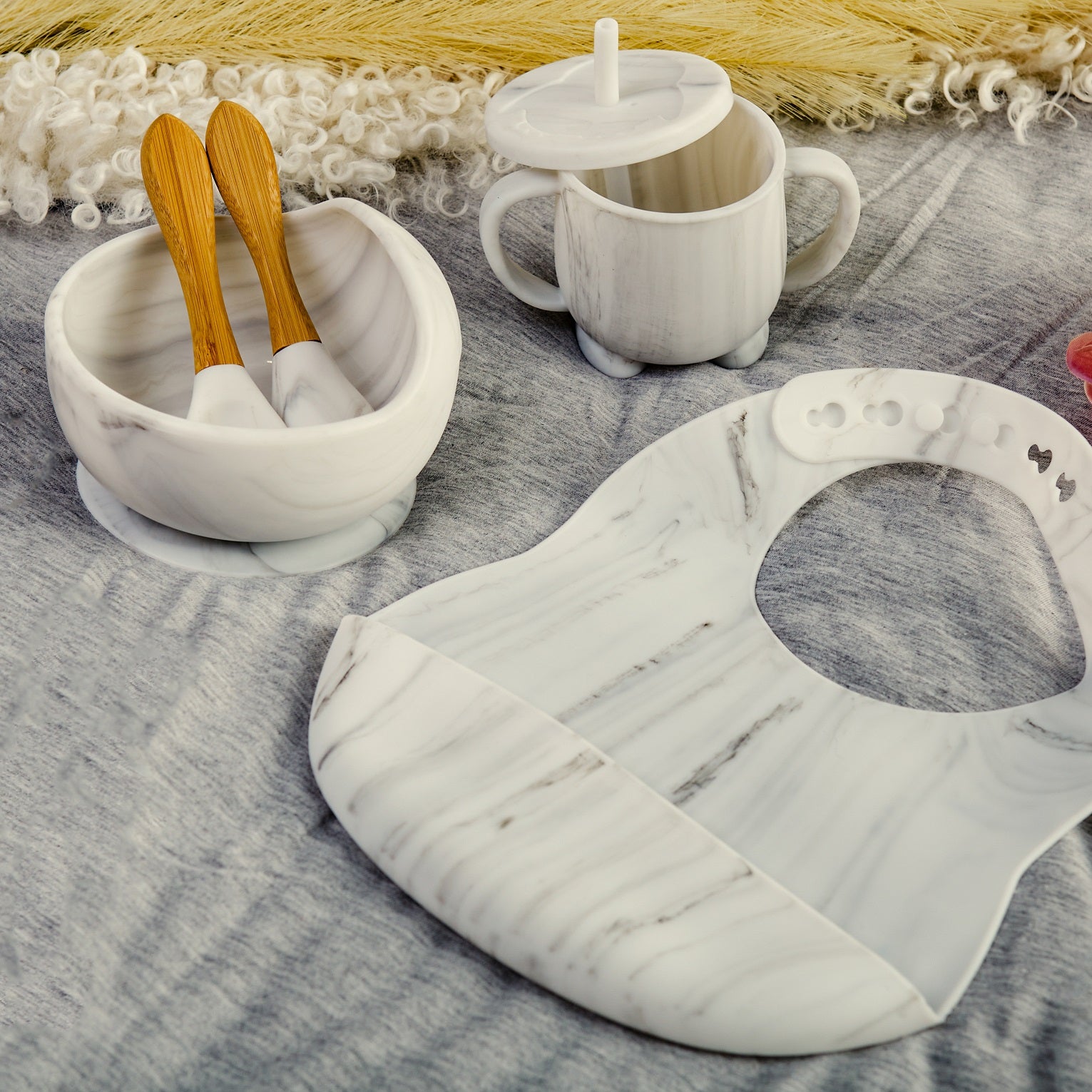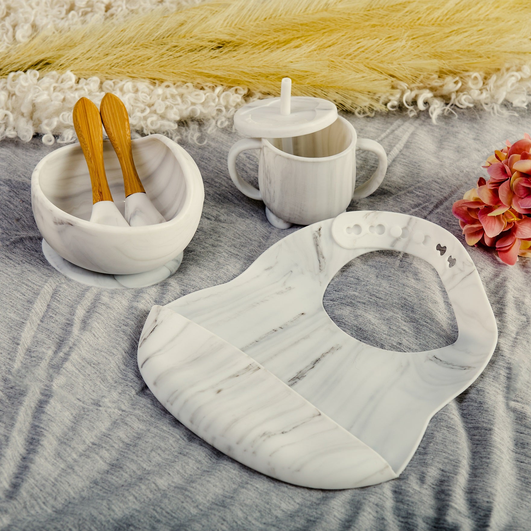 1. Bowl: The clever suction design lets you quickly attach it to the table surface. 2. Bib: Has a wide front pocket so all the spillage falls and holds onto the pocket (neck adjustable from 3months to - 6months). 3. Suction cup with straw: easy suction bottom keeps the cup upright and stable. 4. Twin pack spoon: Smooth and soft on your baby's gums, they are perfect for feeding.