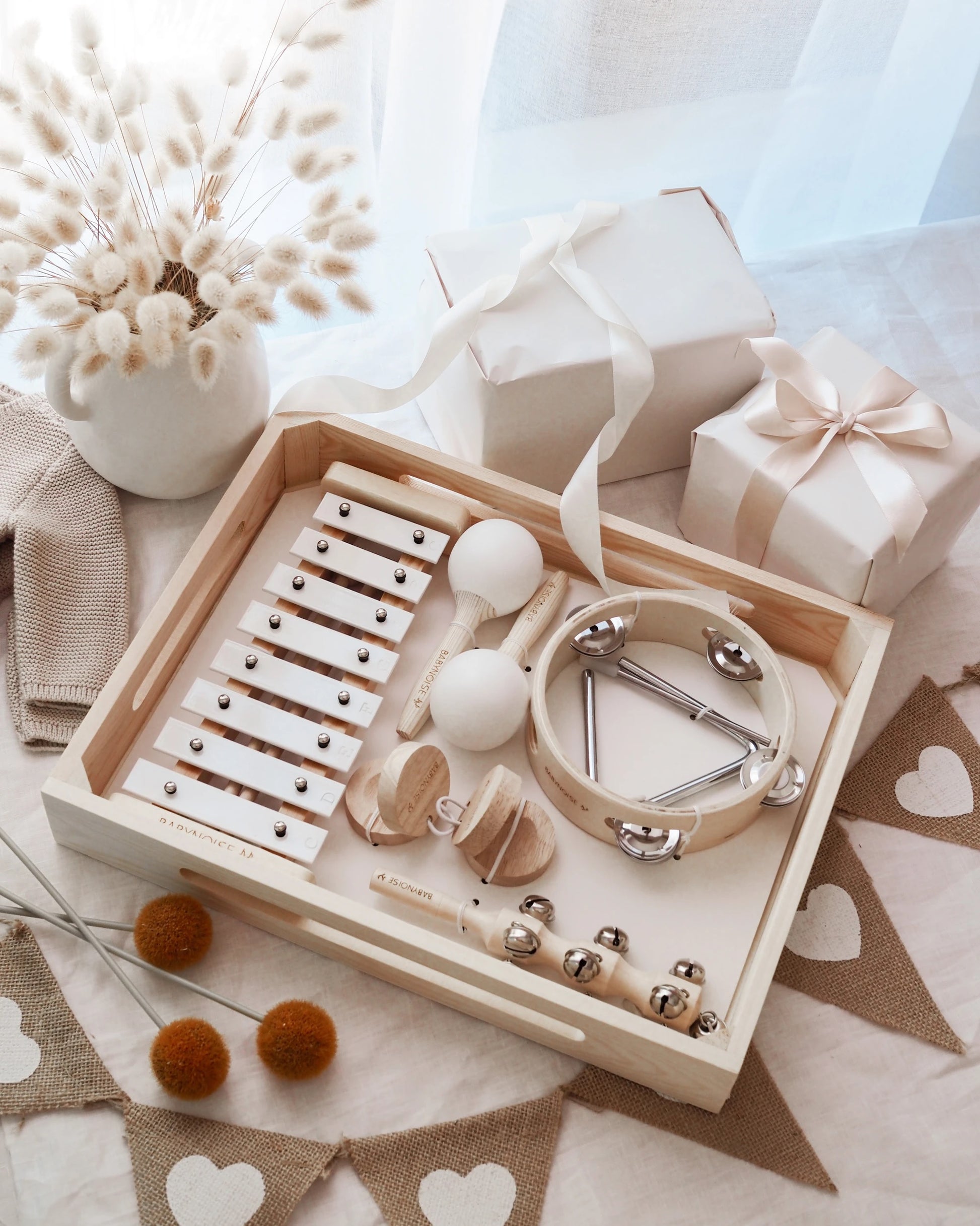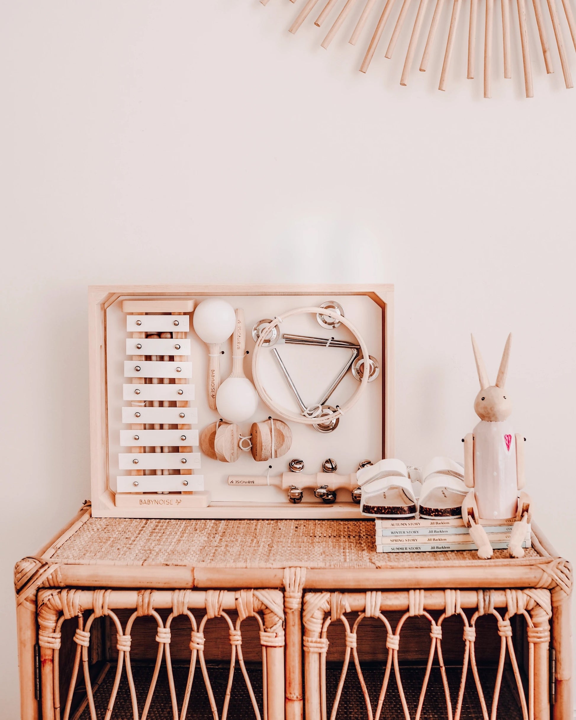 Our musical box set is major value for money worth over $155 and jam packed with all our favourites plus some limited editions the beautiful white xylophone which comes with TWO sticks so you can enjoy it with your little babe, two maracas, our wooden tambourine bells and castanets which are great for fine motor skills along with our mini triangle. On top of all of this included you also get the beautiful timber tray so be used in many ways storage, small world play, sensory, kitchen play ! The sky is the limit with our musical box set.