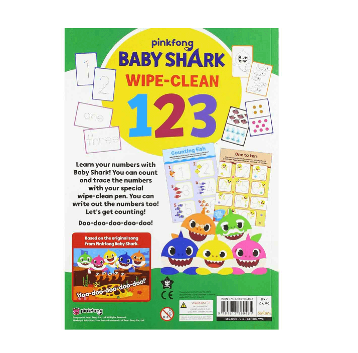 Learn how to write numbers with Baby Shark. 36 wipe clean flash cards and marker make it fun and easy to practice anywhere, anytime.